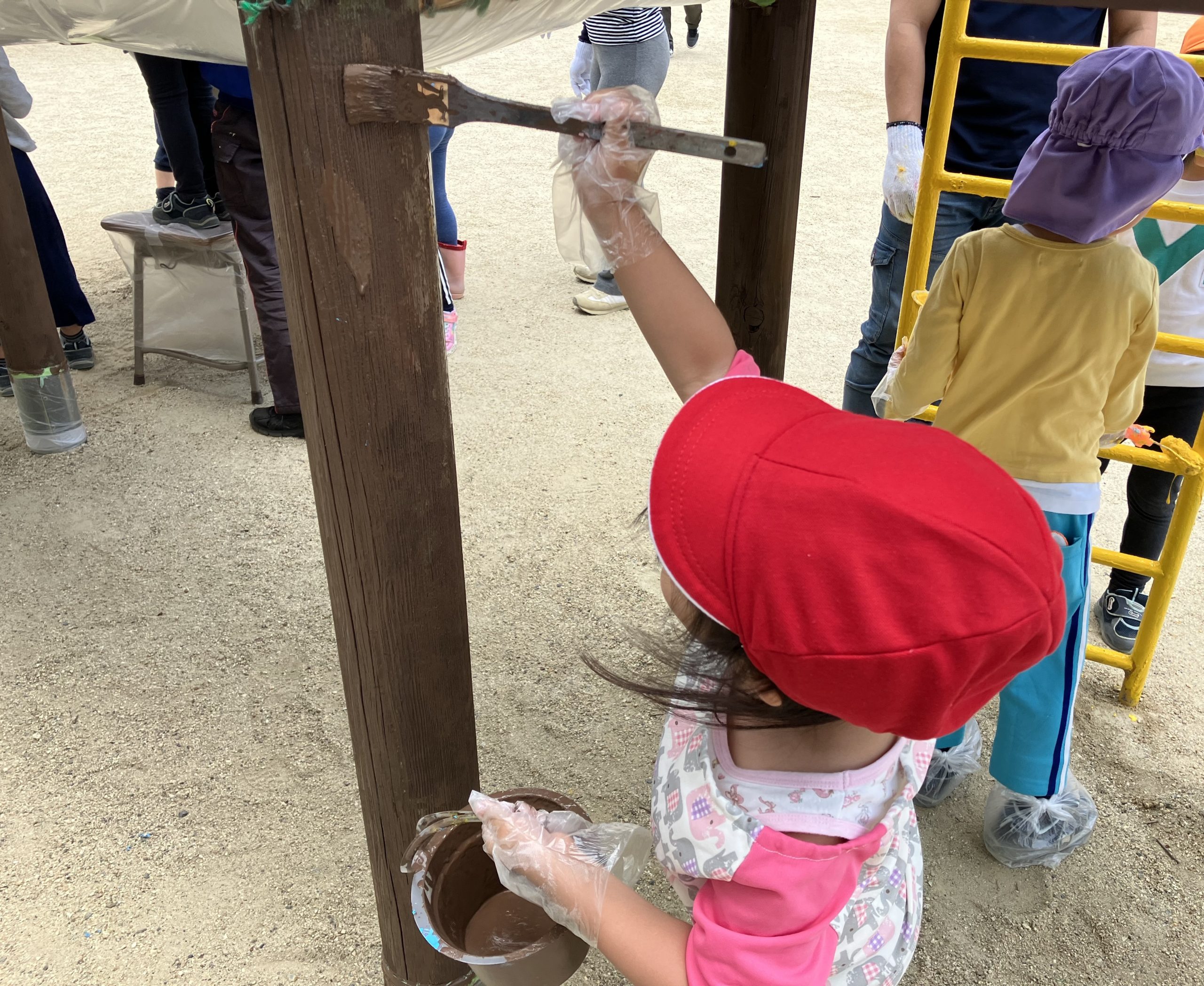 先日、枚方市にある鴻池第三幼稚園にて、幼稚園施設内にある遊具のボランティア塗装を行いました。